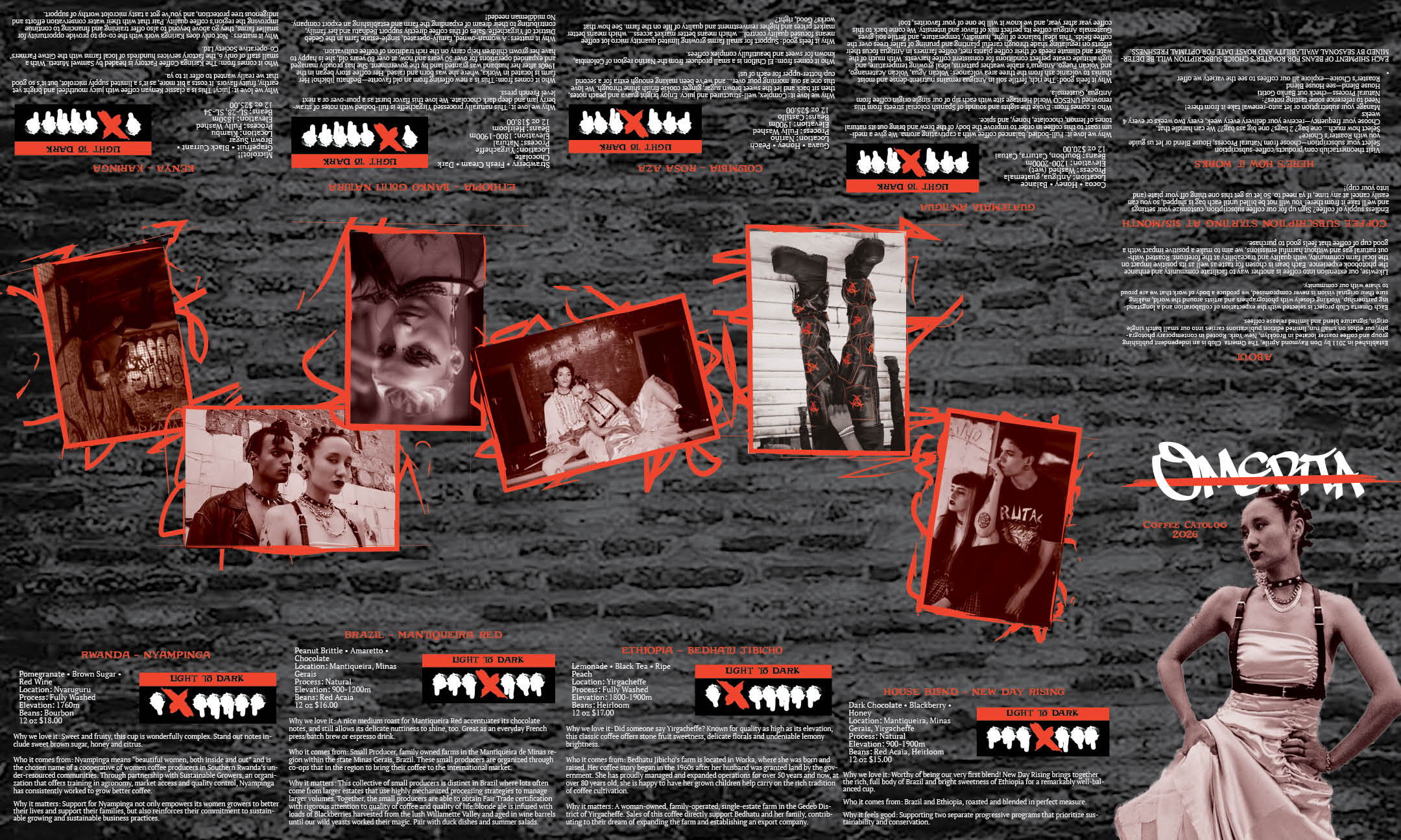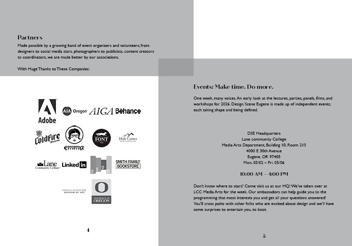 This project the goal was to create a brand from the discription of the company I were assigned. I needed to learn their goals, their intended audience and where the company will be located. With this information I was to design a logo, a stationary set and finally create a brand standards.This project the goal was to create a brand from the discription of The Omerta Club. This club is a coffee roaster and small press publisher specializing in photography books located in Brooklyn, NY. I needed to learn their goals, their intended audience and where the company will be located. With this information I was to design a logo, a catolog, and packaging for the coffee offered.In this project I made advertisments that followed the brandstandards set by another student. I needed to make ads that came across well in color and in black and white. In this project I made mailable brochures for MercyCorps following their brandstandards. This is my tri fold square brochure designed to eliminate paper waste as much as possible sized to be able to print to on one 11 x 17 in paper with not need for a bleed trim. In this project I created an event brand for Design Scene Eugene. I designed the logo, the advertisements, and the programs. I will also be designing an app. (These are select spreads from the program.)