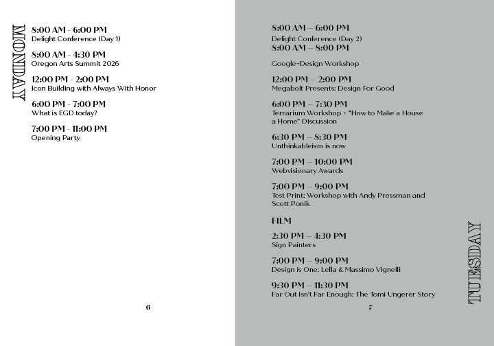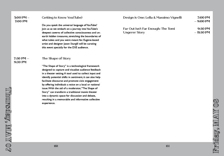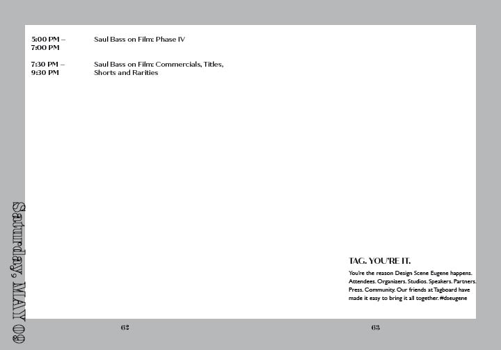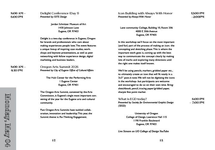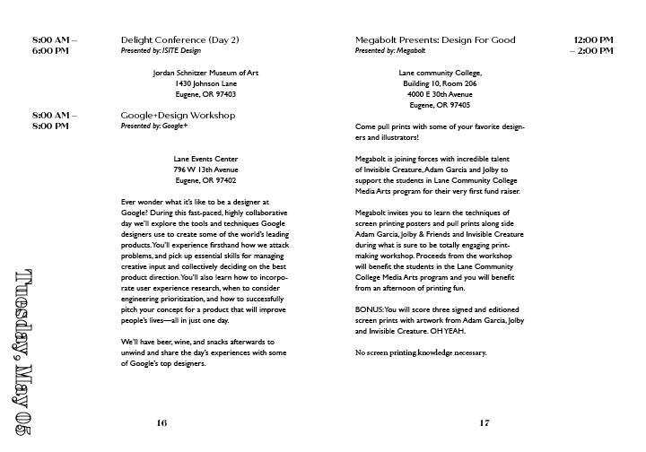 This project the goal was to create a brand from the discription of the company I were assigned. I needed to learn their goals, their intended audience and where the company will be located. With this information I was to design a logo, a stationary set and finally create a brand standards.This project the goal was to create a brand from the discription of The Omerta Club. This club is a coffee roaster and small press publisher specializing in photography books located in Brooklyn, NY. I needed to learn their goals, their intended audience and where the company will be located. With this information I was to design a logo, a catolog, and packaging for the coffee offered.In this project I made advertisments that followed the brandstandards set by another student. I needed to make ads that came across well in color and in black and white. In this project I made mailable brochures for MercyCorps following their brandstandards. This is my tri fold square brochure designed to eliminate paper waste as much as possible sized to be able to print to on one 11 x 17 in paper with not need for a bleed trim. In this project I created an event brand for Design Scene Eugene. I designed the logo, the advertisements, and the programs. I will also be designing an app. (These are select spreads from the program.)